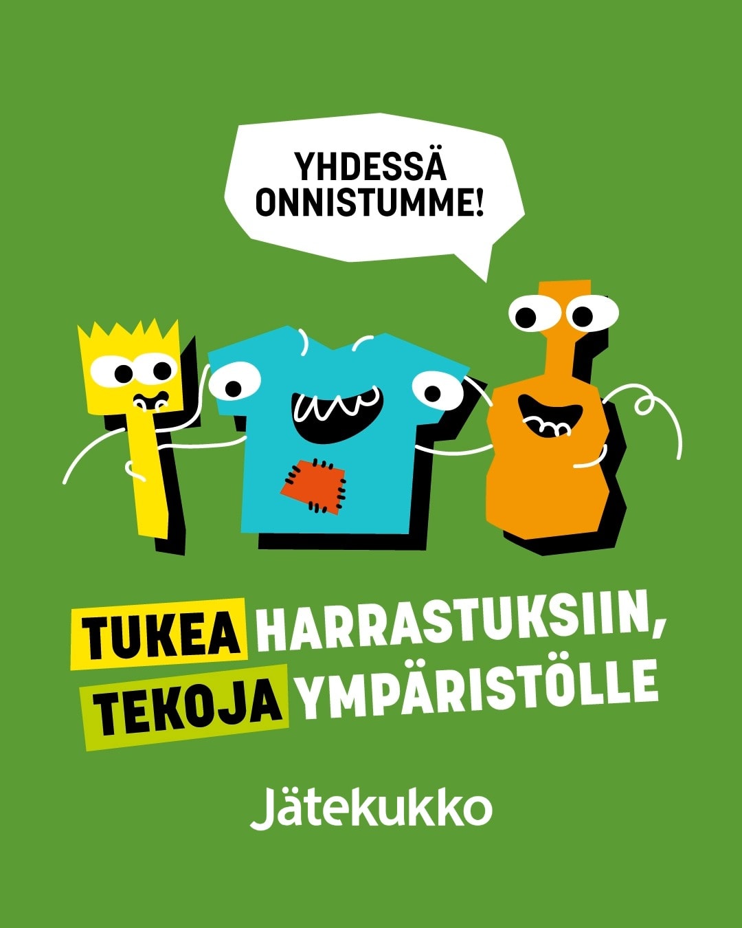 Jätekukon Kestävän tulevaisuuden yhteistyö -ohjelma tukee lasten ja nuorten toimintaa, joka jakaa kanssamme yhteiset ympäristövastuullisuuden ja tasavertaisuuden arvot. Tavoitteena on kannustaa jokaista toimimaan arjessaan ja harrastuksissaan entistä vastuullisemmin.